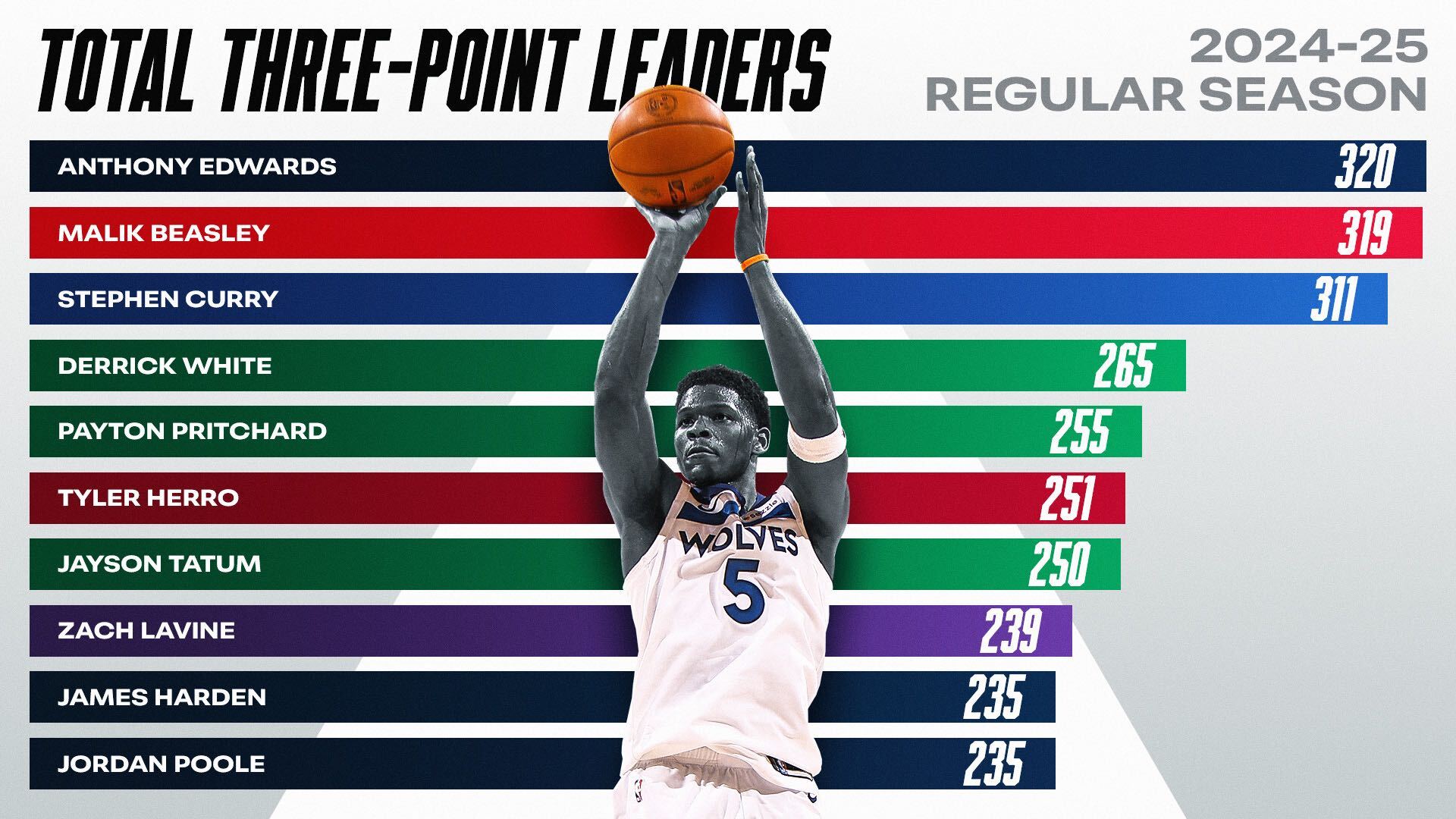 Anthony Edwards: 320 Malik Beasley: 319 Stephen Curry: 311 Derrick White: 265 Payton Pritchard: 255