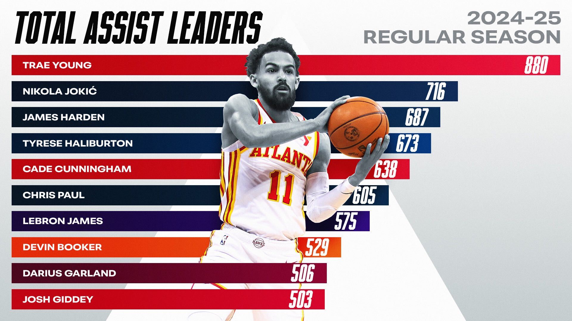 Trae Young: 880 Nikola Jokić: 716 James Harden: 687 Tyrese Haliburton: 673 Cade Cunningham: 638