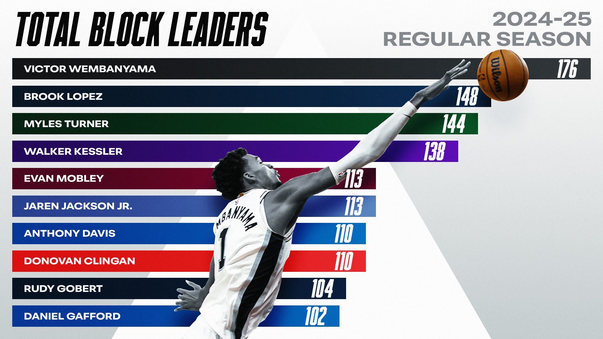 Victor Wembanyama: 176 Brook Lopez: 148 Myles Turner: 144 Walker Kessler: 138 Evan Mobley: 113 Jaren Jackson Jr.: 113