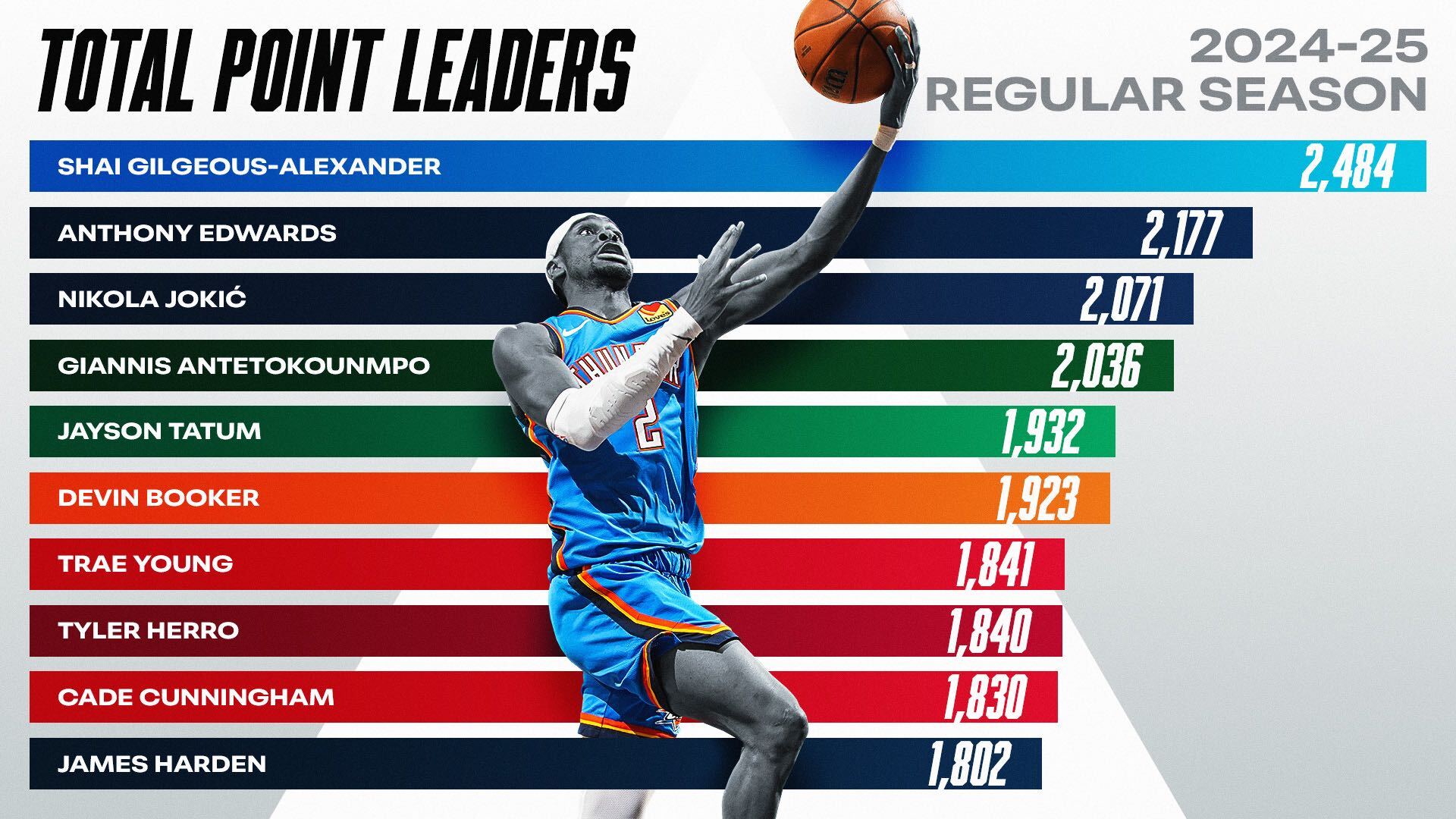 Shai Gilgeous-Alexander’ın 2.484 puanı 2018-19’da James Harden’den bu yana tek bir sezonda en çok oldu.