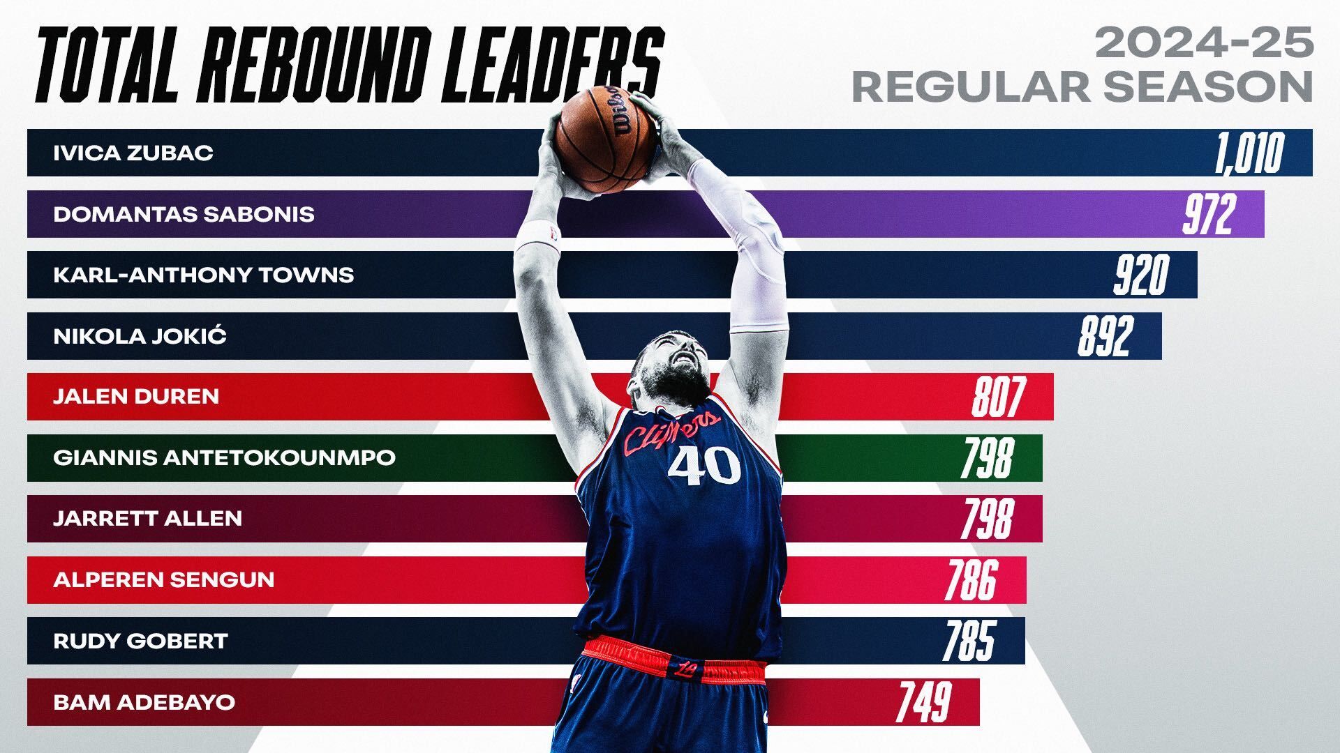 IVICA ZUBAC: 1.010 Domantas Sabonis: 972 Karl-Anthony Towns: 920 Nikola Jokić: 892 Jalen Duren: 807