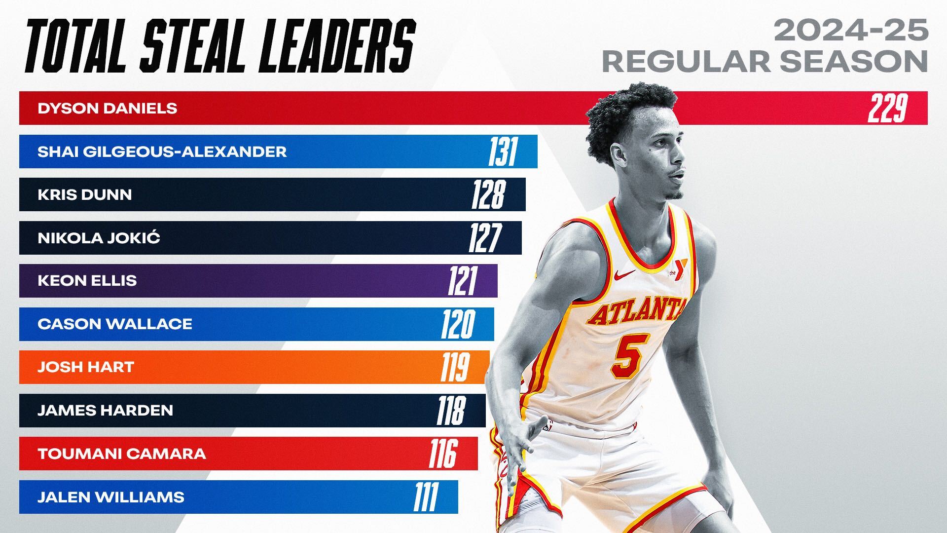 Dyson Daniels: 229 Shai Gilgeous-Alexander: 131 Kris Dunn: 128 Nikola Jokić: 127 Keon Ellis: 121