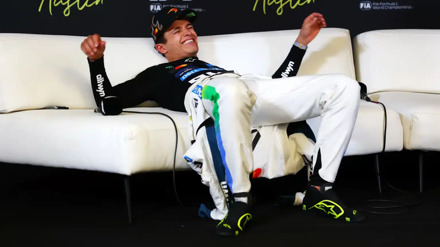 LN: Who knows? What was it that you (Berstappen) said once — “if your mum had balls… she’d be your dad”? Yeah. Who knows. But, you know, starting on the Soft, starting on the right side of the grid… He had the advantage in Turn 1, on the outside. After yesterday, obviously a little bit wary — didn’t want to go too wide in Turn 1 because I didn’t want to end up in the gravel again. So yeah, I kind of had to just stay on the inside and stick to the safer route. But Charles did a good job and I got passed. Who knows after that? You know, I think I found it difficult enough just to get close to Charles, and their pace wasn’t bad at all. Until, what, 10 laps to go he was like six seconds off Max. So it wasn’t like we were that far away, or their pace was that bad. So, you know, I think it was a good race. The pace was pretty close. I think that’s why it was so difficult — because we were quicker, for sure, but not by a lot. And therefore, there were some challenging lap-after-lap battles, trying to put him under pressure, trying to make him make some mistakes here and there. He didn’t make many, for sure. But I think especially the final stint, I managed to get the tyres into a good window, drop back a few seconds, re-attack, and I managed to kind of catch him a bit more off guard, let’s say, with a couple of laps. So, a good result in the end. For a minute, I was not expecting to finish second. I thought he was just a bit too quick for us. But to get back into second and get past was perfect.